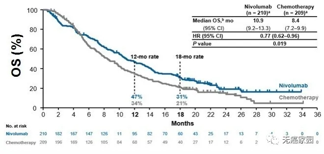 结果显示,与化疗组相比,Opdivo治疗组中位生存期显著改善、死亡风险降低23%(HR=0.77)、中位生存期OS延长2.5个月(10.9个月 vs 8.4个月)。