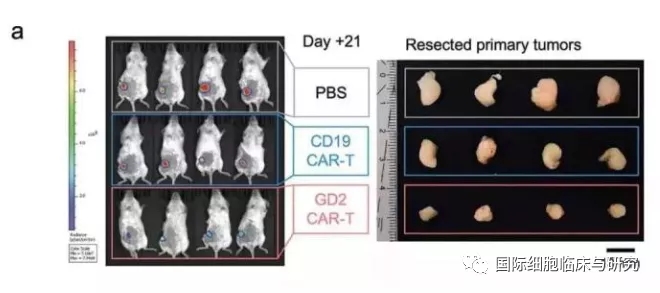 在小鼠实验中显示,与CD19-CAR-T细胞相比,GD2-CAR-T细胞对肿瘤细胞的抑制生长作用更明显,肿瘤组织的体积与CD19- CAR-T小鼠相差了1-2倍。更重要的是,研究人员还发现,所有经过GD2-CAR-T细胞治疗的小鼠肺部都没有出现转移的癌细胞,而所有经过CD19- CAR-T细胞处理的小鼠在肺部都检测到了转移的癌细胞。