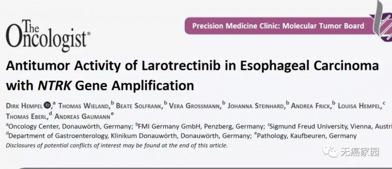 今天小编就跟各位癌友分享一则2020年4月份刊登在《The Oncologist》杂志上的NTRK基因扩增食管癌临床案例,以供大家参考。