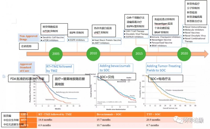 近十年,脑胶质瘤的治疗在靶向治疗,免疫治疗(1.免疫检查点抑制剂;2.过继性细胞免疫疗法;3.治疗性疫苗;4.溶瘤病毒)取得了前所未有的进展,在给病友们来了全新的生存希望(见下表)。全球肿瘤医生网医学部盘点了近期胶质瘤的靶向,免疫重磅治疗进展供大家参考,如果想了解或申请下面治疗方案,可以致电全球肿瘤医生网医学部进行初步评估。