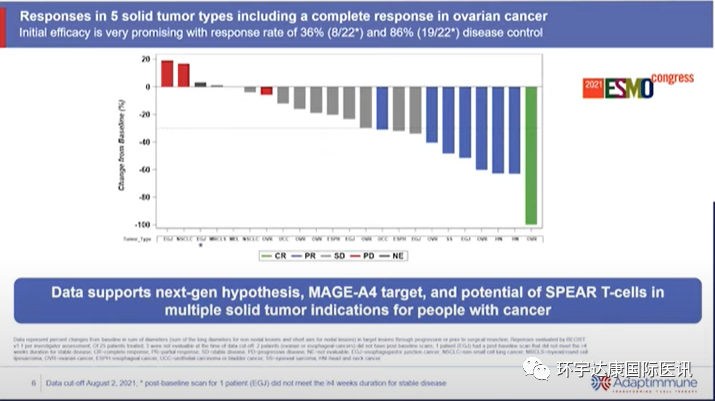 除此之外,2021年9月13日,美国Adaptimmune Therapeutics公司宣布其新型TCR-T疗法ADP-A2M4CD8 细胞疗法在多个实体瘤中进行的 1 期 SURPASS 试验的最新数据显示,该疗法具有抗肿瘤活性,并且5类实体瘤出现响应!