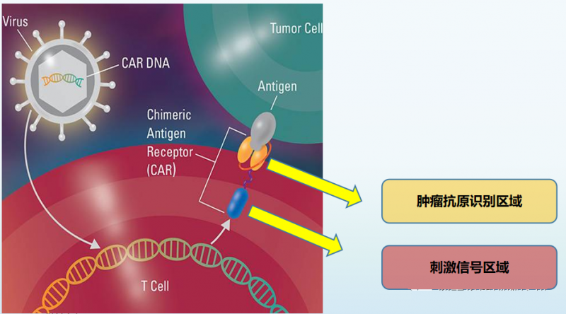 这张图片形象的展示了CAR-T疗法的工作原理:细胞工程技术对杀手T细胞进行基因编辑,在T细胞表面产生名为嵌合抗原受体(CAR)的蛋白质。这张图就是CAR,它在T细胞膜上插着,细胞外的灰橘色小导弹一样的装置就是肿瘤抗原识别区,细胞内部的蓝色香肠是刺激信号区域。当装了“GPS”导航的小导弹找到癌细胞表面的抗原并与之结合时,刺激区接受到信号之后启动杀敌模式,精准清除癌细胞。