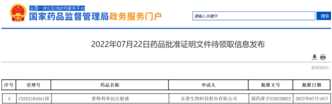 [1]2022年07月22日药品批准证明文件待领取信息发布 .Retrieved July 22,2022, from https://www.nmpa.gov.cn/zwfw/sdxx/sdxxyp/yppjfb/20220722090109108.html