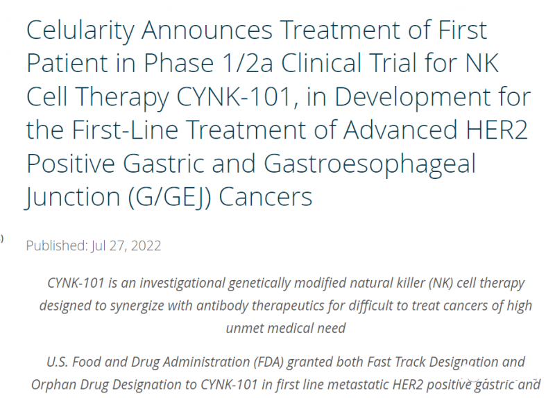 2022年7月27日,Celularity生物技术公司宣布,其研发的NK细胞疗法CYNK-101的1/2a期临床试验已经完成了首例患者给药,该试验针对晚期HER2阳性胃或胃食管交界处(G/GEJ)癌症的一线治疗。