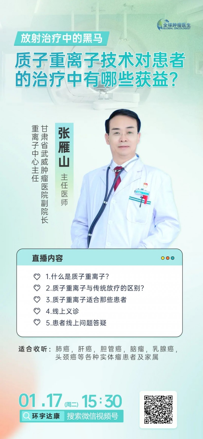 直播预告|2023年1月17日甘肃武威肿瘤医院副院长张雁山主任:质子重离子可以治疗哪些肿瘤