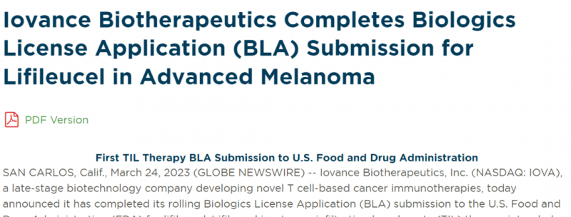 药物介绍:Lifileucel是一种基于肿瘤浸润淋巴细胞(TIL)的新型的过继细胞免疫疗法。2023 年 3 月 24 日,美国Iovance生物公司宣布,已正式完成肿瘤浸润淋巴细胞( TIL )疗法-- lifileucel向 FDA 提交的滚动生物技术许可申请(BLA),用于PD-1/L1和靶向治疗进展后的晚期(不可切除或转移性)黑色素瘤患者。这是全球首款向FDA正式提交上市申请的实体瘤TIL疗法,这意味着大名鼎鼎的TIL疗法距离上市的脚步越来越近啦!