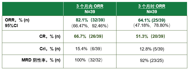 3、微小残留病灶阴性率(MRD):在治疗3个月以内,达“完全缓解但计数不完全恢复”(CR/CRi)患者的MRD阴性率为100%;达“完全缓解”患者的MRD阴性率为92.0%。