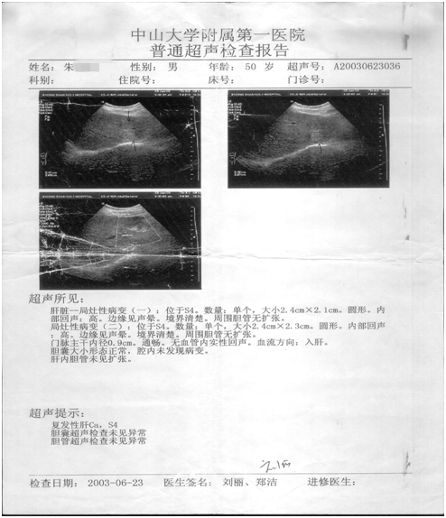 一个疗程后复查:肝内二个复发灶全部消失;双肺8个转移灶减少4个,最大的缩小 50%(1.2X1.2cm ---0.8X0.8cm);血清AFP 由4.5万降到1.2万ug/L,20天后降到644.54ug/L。