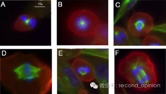 微管(绿色)、肌动蛋白(红色)、DNA(蓝色)