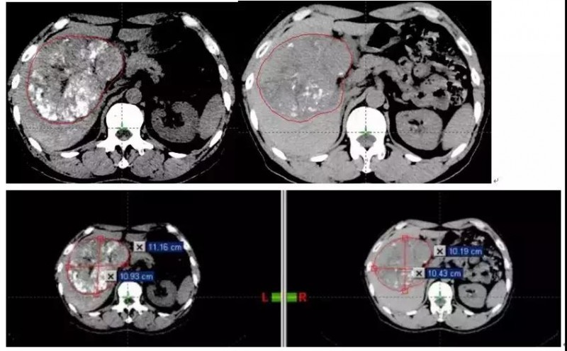 质子治疗前该层面肿瘤大小约10.93*11.16cm,质子治疗一个月后约10.43*10.19cm;质子治疗前体积约为860.06cm3,质子治疗一个月后肿瘤体积约为702.69cm3,肿瘤缩小约157.37cm3,症状明显改善。三个月后复查肿瘤依旧在缩小,患者无其他副作用,完全可以正常生活。