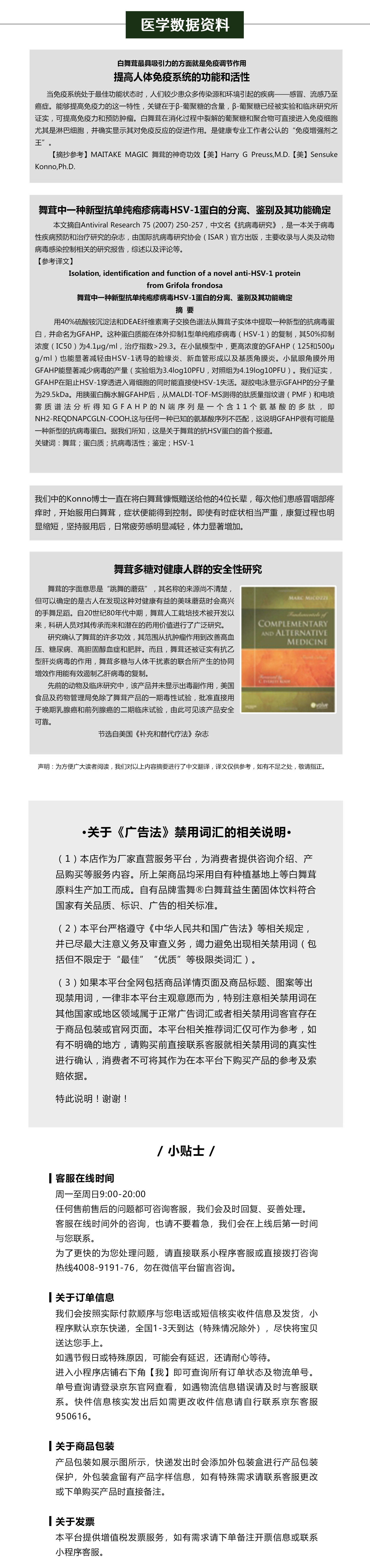 1盒(2g*24袋/盒),每袋含舞茸多糖160mg,40°C温水以下饮用,建议每日4-6袋